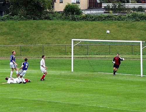 Oestricher Torwart in Höhe des 11 Meter Punktes tunneln und die Kuh