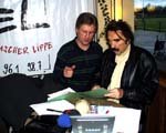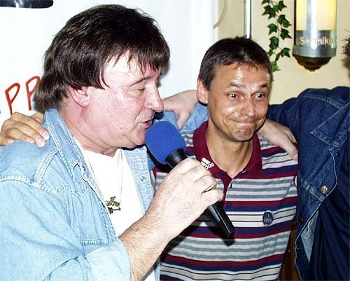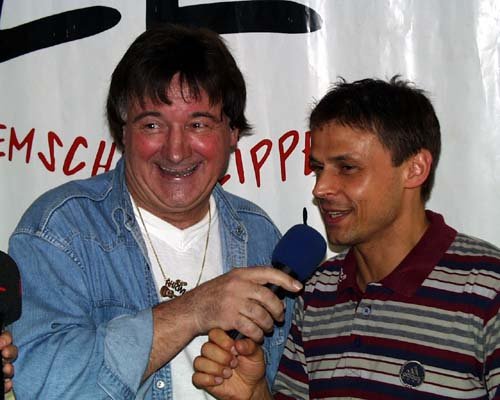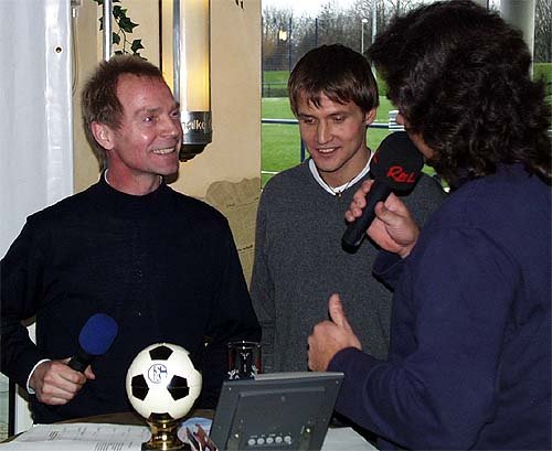 Sendung der Nordkurve im "Der Schalker" mit Ährwin Weiss und Tomasz Hajto für die heutige Ausgabe der Nordkurve war endlich mal wieder ein Spieler aus dem aktuellen Kader angesagt und recht viele Leute freuten sich auf Tomasz Hajto. Der mußte sich allerdings erst mal auf dem Trainingsplatz rumplagen, es war also abzusehen, daß er nicht pünktlich kommen würde. Der zufällig anwesende Erwin Weiss stellte sich aber spontan zur Überbrückung der ersten halben Stunde zur Verfügung. (Irgendwie blieb ihm auch nichts anderes übrig.... ;o) ) Erwin sang natürlich erst mal das Vereinslied und wurde dabei von den Anwesenden kräftig unterstützt. Man sprach dann natürlich über Ährwin und Schalke. Der „Barde“ gab zu, daß er am Sonntag vorm Fernseher geheult hat und erst mal ne Flasche Sekt aufmachen mußte, weil das so trocken nicht zu ertragen war. Erwin versprach, auch für den eventuellen Pokalsieg ein Liedchen aus dem Ärmel zu zaubern - schaun mer mal. In der Pause holte Ährwin schnell noch ein Playback aus dem Auto und wir kamen dann in den Genuß von „Mäusken willze mit mich Eis essen gehen?“. Die Stimmung war schnell auf dem Siedepunkt, Ährwin ist halt Profi..... Dirk fragte dann noch wo man die CDs käuflich erwerben kann - einfach hier klicken. Am Donnerstag singt Ährwin in Essen in der alten Dampfbierbrauerei, ansonsten gibt es im Moment nichts aktuelles, aber das kann sich ja noch ändern. Um 17:45 Uhr stand dann Tomasz Hajto in der Tür und bekam live mit, was denn so die Anwesenden von ihm halten. So wie er guckte, fand er das ganz interessant. Natürlich wurden hauptsächlich seine weiten Einwürfe und die vielen gelben Karten angesprochen. Letzteres kann er eigentlich nicht mehr hören, wer kann es ihm verdenken. Zu den langen Einwürfen kam es eher durch Zufall, er hat es einfach probiert und so sein Talent entdeckt. Erst mal lobte er seine Kollegen und meinte, daß Schalke auf einem guten Weg ist. Das Abwehrteam mit Nico und Tomasz Waldoch arbeitet prima zusammen, na das haben wir ja alle schon mehrfach eindrucksvoll bewiesen bekommen.